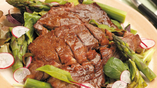 ②フライパンにサラダ油をひいて①を焼き、皿に盛ってトマトやアスパラを添える。