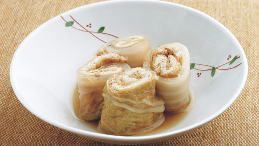 ②にんにく、しょうがを炒め香りが出たら、めんつゆと水を加え少々煮つめ、ソースを作る。
