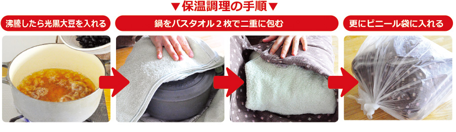 ①厚手の鍋にAを入れて熱し、沸騰したら黒大豆を加えてふたをかぶせ、火から下ろし、バスタオル2枚で二重に包み、更にビニール袋で包んで3時間くらい放置する(「保温調理」で味をしみこませながら豆を戻す)。